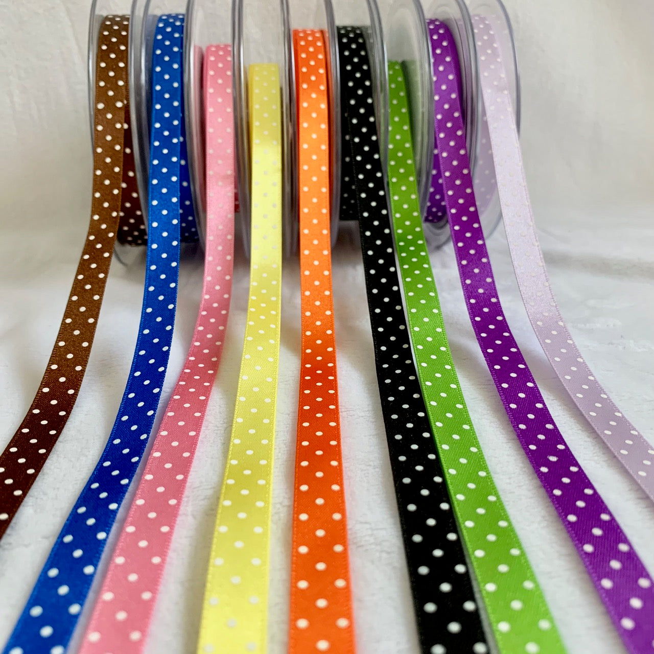 This 100% polyester Micro Dot Ribbon is available initially in 12 colours in three sizes; 10mm, 15mm and 25mm. As we grow the range will increase to include all sizes and all colours in the range.